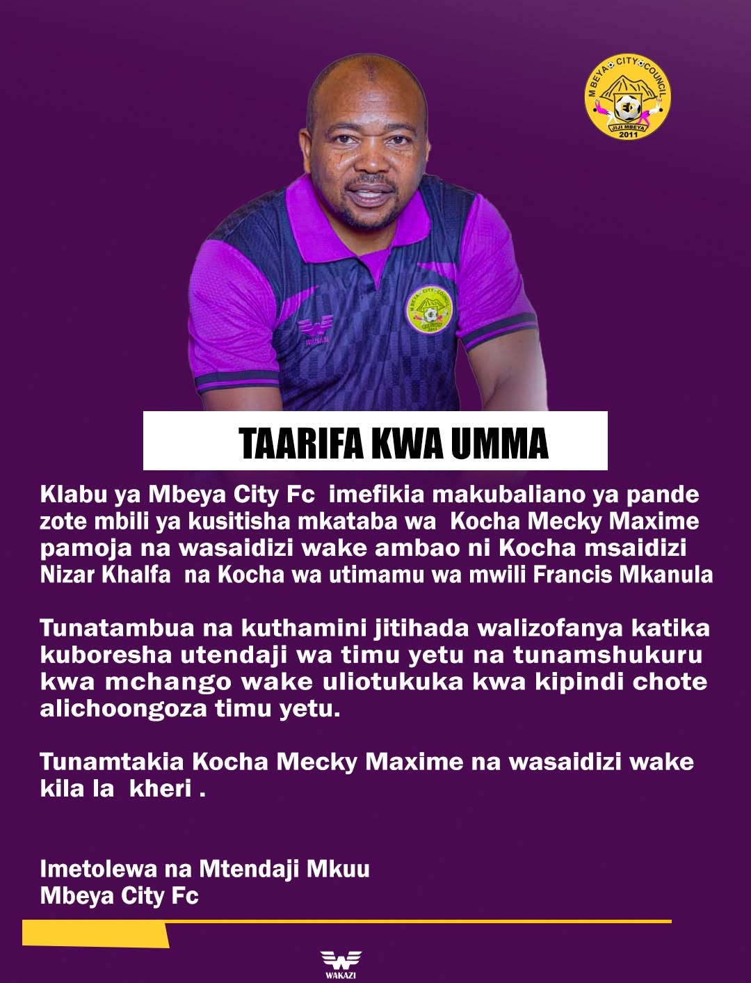 Klabu ya Mbeya City imemfuta kazi Kocha Meckie Mexime na makocha wasaidizi baada ya kipigo cha mabao 6-0 dhidi ya Yanga katika mchezo wa ligi kuu uliopigwa uwanja wa KMC Complex.
