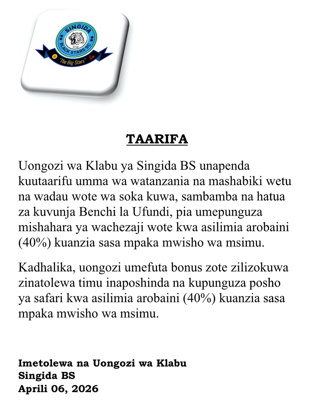 A statement released by Singida BS indicated that players will receive reduced salaries until the end of the season.
