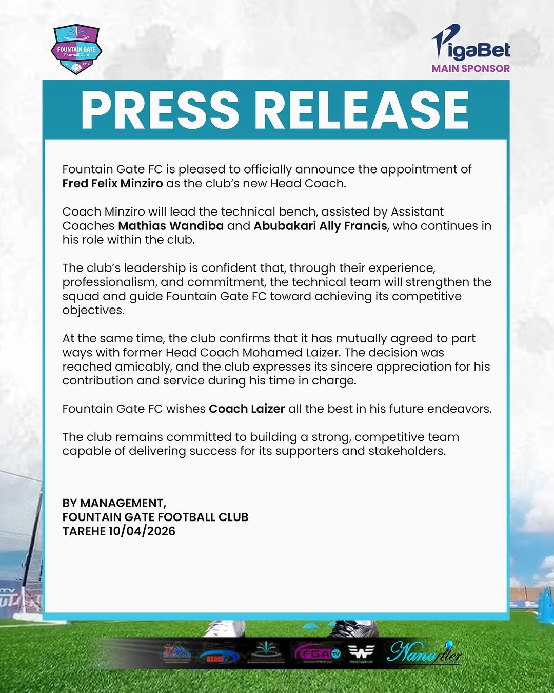 Fountain Gate have officially announced Fredy Felix Minziro as the club’s new Head Coach, assisted by Mathias Wandiba and Aboubakar Francis.